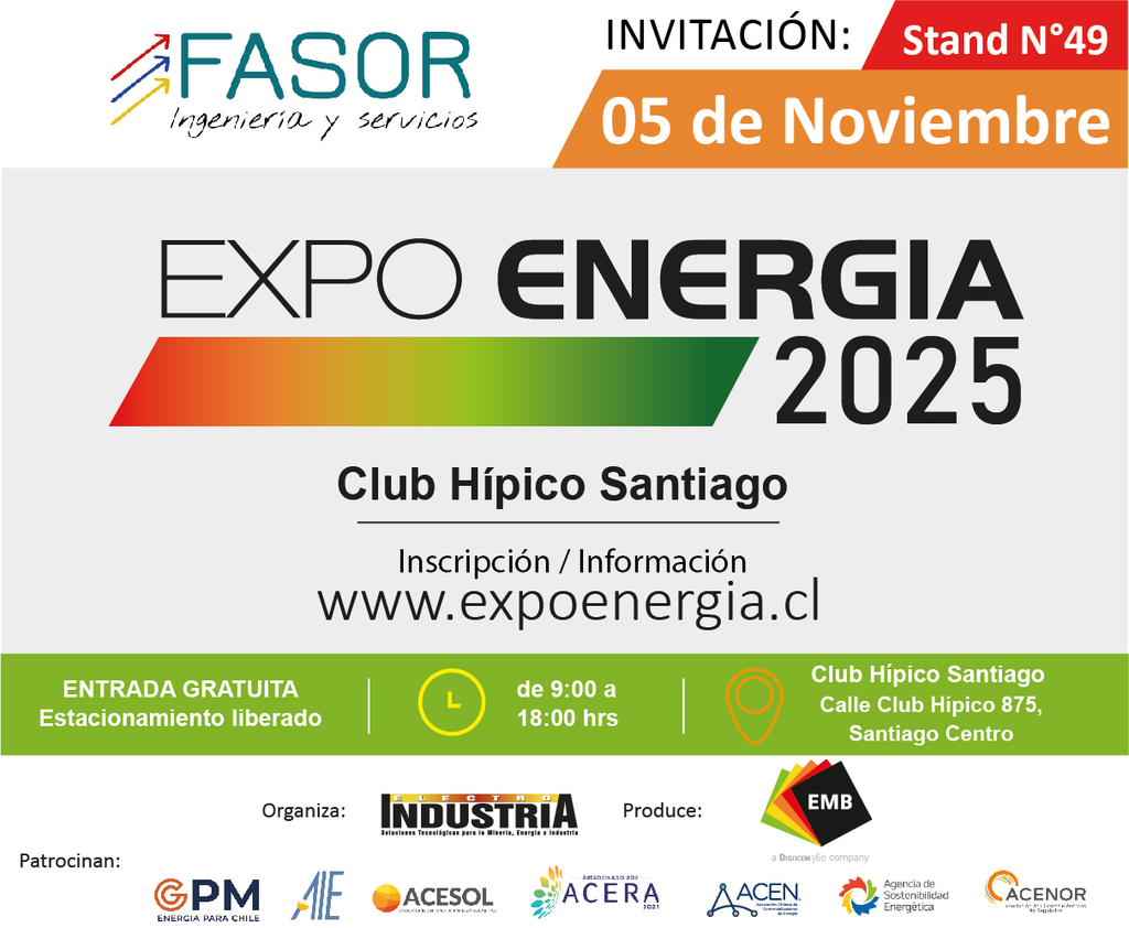 FASOR Ingeniería en Expo Energía 2025Cristian Valenzuela Morales11/09/2025Estaremos presentado nuestros equipos y servicios en la Expo Energía 2025 organizada por la revista ELECTROINDUSTRIA.